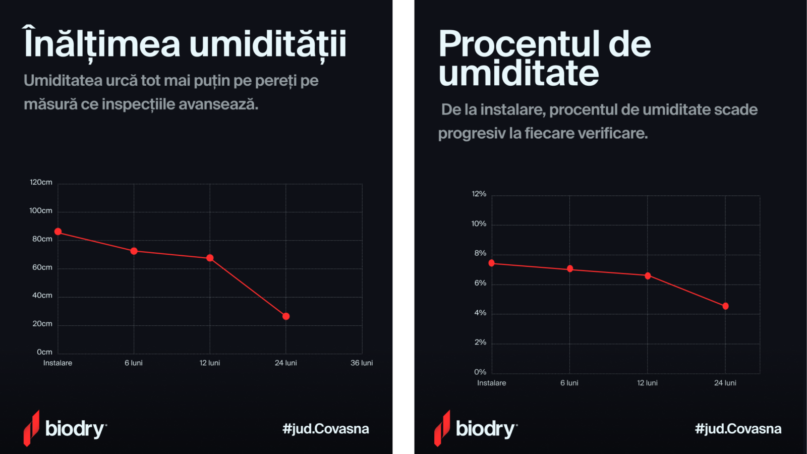 - Rezultate vizibile: Datele strânse pe parcursul a 24 de luni arată clar cum umiditatea a scăzut constant, de la peste 13% la sub 5%. Practic, pereții s-au uscat complet.