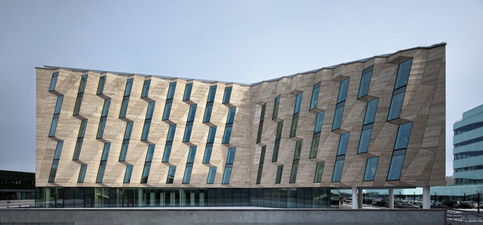 Un exemplu devenit deja reper este sediul Horten din Copenhaga, proiectat de 3XN. Amplasată pe malul mării, clădirea primește un aport solar considerabil, iar răspunsul arhitectural a venit sub forma unei fațade articulate în planuri fracturate, fiecare fereastră fiind orientată astfel încât să evite expunerea directă la soare. Panourile termoizolate placate cu travertin preiau încărcarea termică, reduc strălucirea și limitează consumul energetic estimat cu aproximativ 10%. Rezultatul este o clădire care își gestionează singură mare parte din aportul solar, fără jaluzele, copertine sau sisteme suplimentare. În plus, geometria în zig-zag creează efectul neașteptat ca toți angajații să beneficieze de câte un „colț de lumină”.