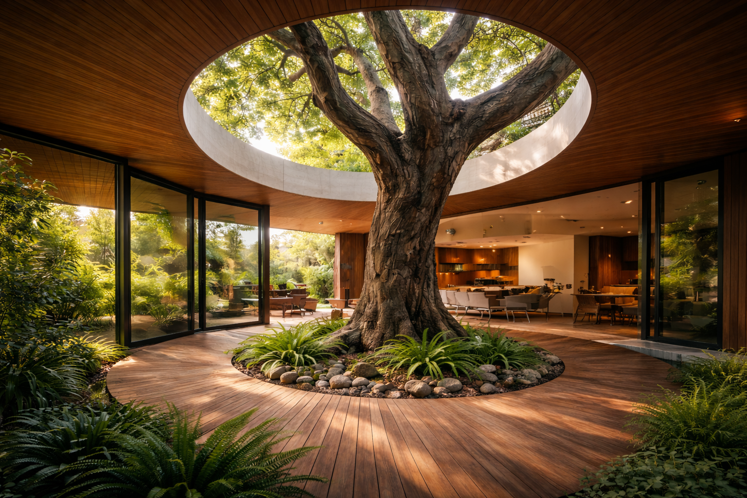 Integrarea copacilor în arhitectura rezidențială sau în proiectele contemporane presupune o schimbare de perspectivă încă din faza de concept. În loc ca terenul să fie tratat ca o suprafață neutră, pregătită pentru a fi modelată integral, proiectul se adaptează la condițiile existente. Planșeele se decupează pentru a permite trecerea trunchiului, volumele se fragmentează pentru a proteja rădăcinile, iar orientarea spațiilor interioare este gândită în funcție de lumină, umbră și coroană. Arhitectura nu mai domină peisajul, ci dialoghează cu el.