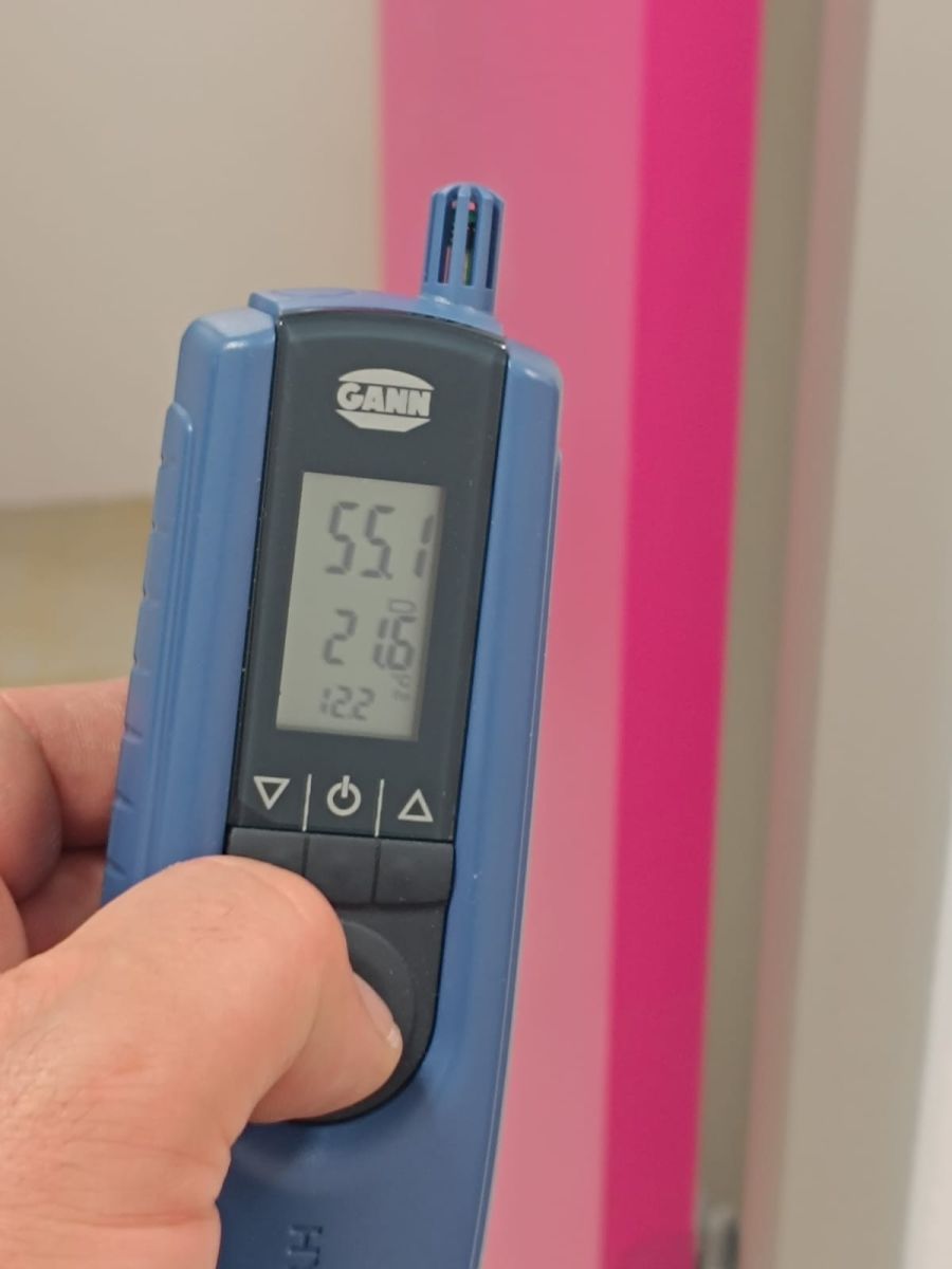 La momentul intervenției, umiditatea relativă a aerului depășea 80%, iar în pardoseală și pereți se înregistrau valori între 65 și 90%, conform măsurătorilor efectuate cu higrometru Gann BL-B2.