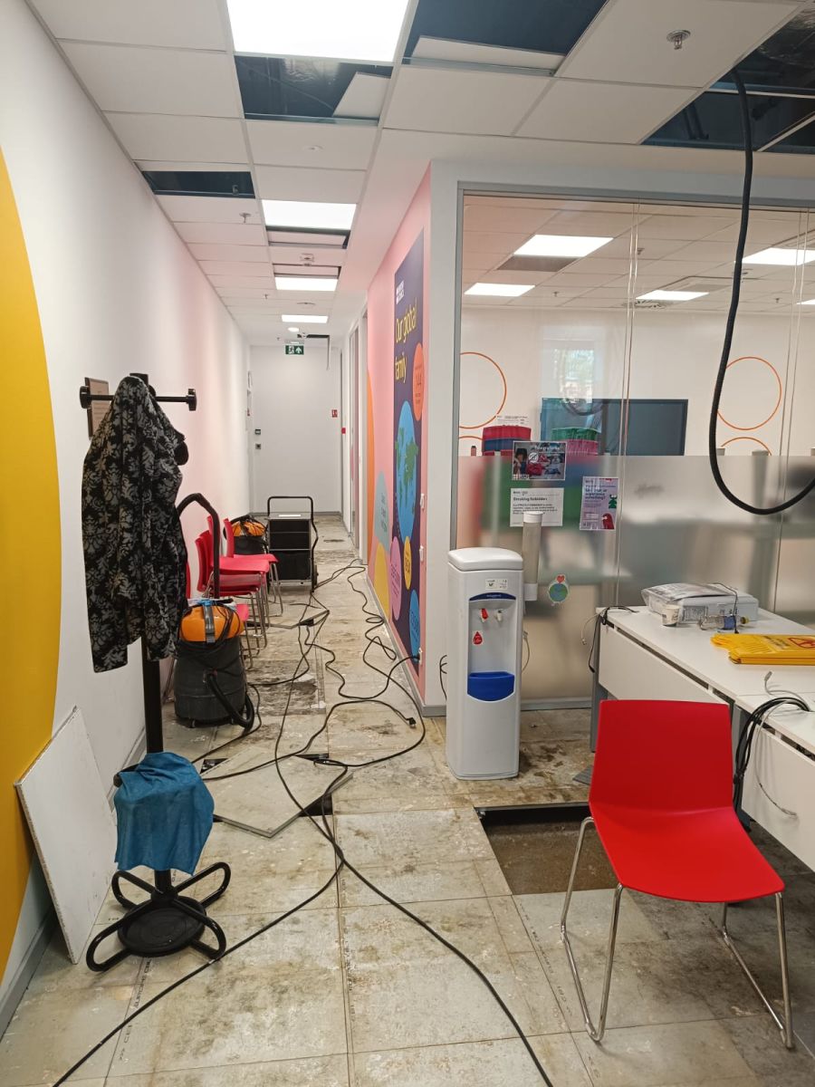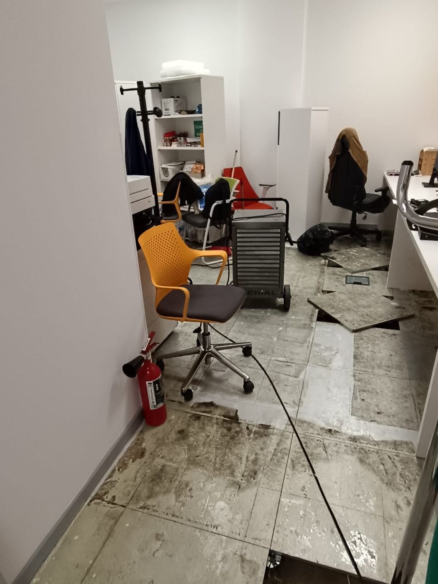 La sfârșitul lunii octombrie 2025, o conductă de alimentare cu apă rece s-a fisurat în tavanul fals al unui etaj superior dintr-o clădire de birouri din București, sectorul 5. Apa s-a infiltrat prin planșeu și a afectat o suprafață de aproximativ 400 m² de birouri open-space și săli de ședință.