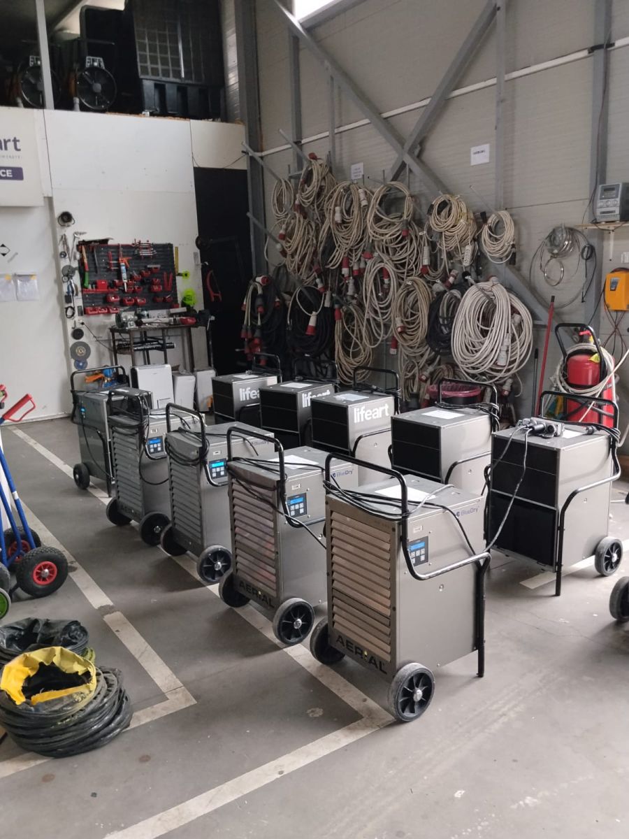 - Dezumidificare intensivă cu 11 echipamente Aerial AD660, fiecare cu o capacitate de 70 l/zi, poziționate strategic pentru acoperirea uniformă a spațiului.