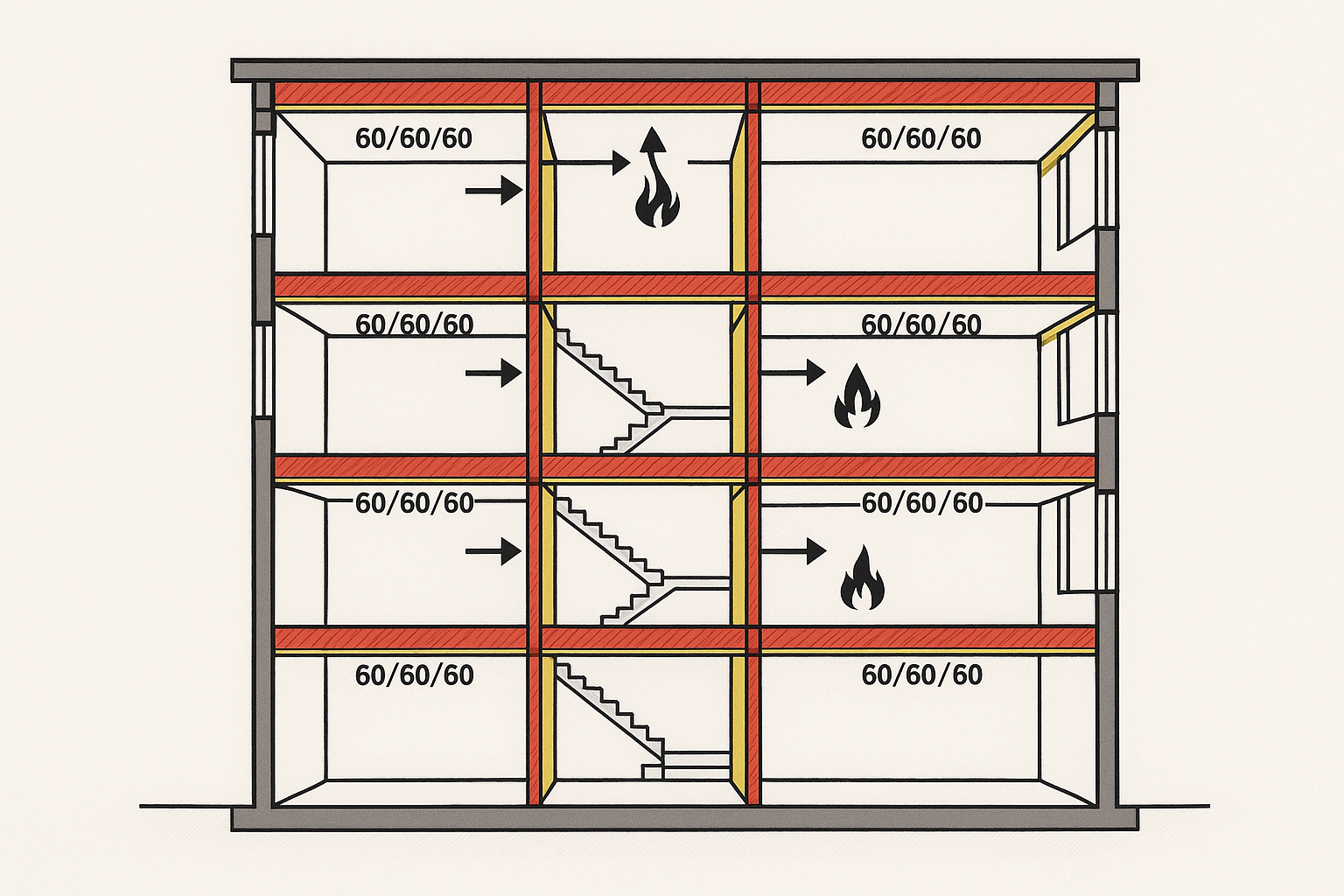 Pereții, planșeele și tavanele rezistente la foc ajută la oprirea răspândirii fumului și a flăcărilor. Aceste bariere sunt concepute pentru a menține structura sigură pentru o anumită perioadă de timp, măsurată de obicei prin clasificări de rezistență la foc (de exemplu, 60/60/60 pentru rezistență mecanică, integritate și izolare). Pentru a evita modificările structurale ulterioare, aceste clasificări trebuie planificate din timp.