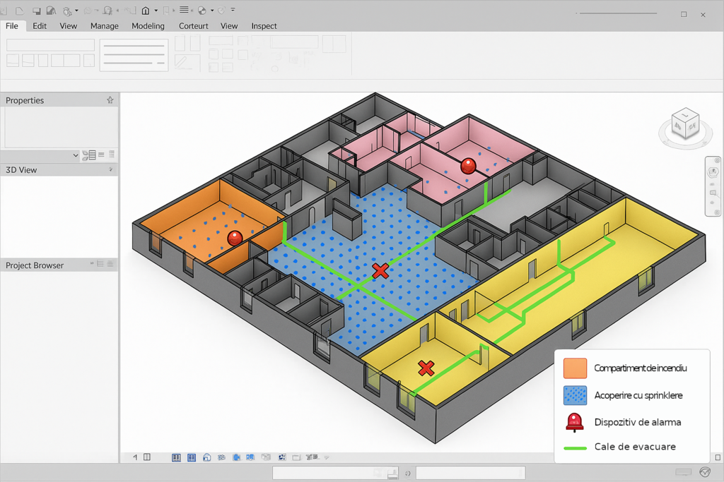 Coordonare vizuală și detectarea conflictelor: Tehnologiile BIM permit echipelor să vizualizeze într-un singur model zonele de incendiu, rutele de evacuare, acoperirea cu sprinklere și amplasarea dispozitivelor de detecție. Această claritate ajută atât la coordonarea tehnică, cât și la comunicarea cu părțile interesate.